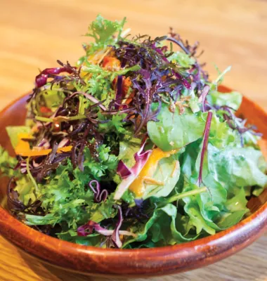市場を通さずに農家さんから直接お店に届くお野菜で作るリーフサラダです。自然栽培、有機無農薬、減農薬など栽培方法は様々ですが、安全なお野菜を心を込めて作ってくれる農家さんから仕入れたお野菜をたくさん食べていってください。