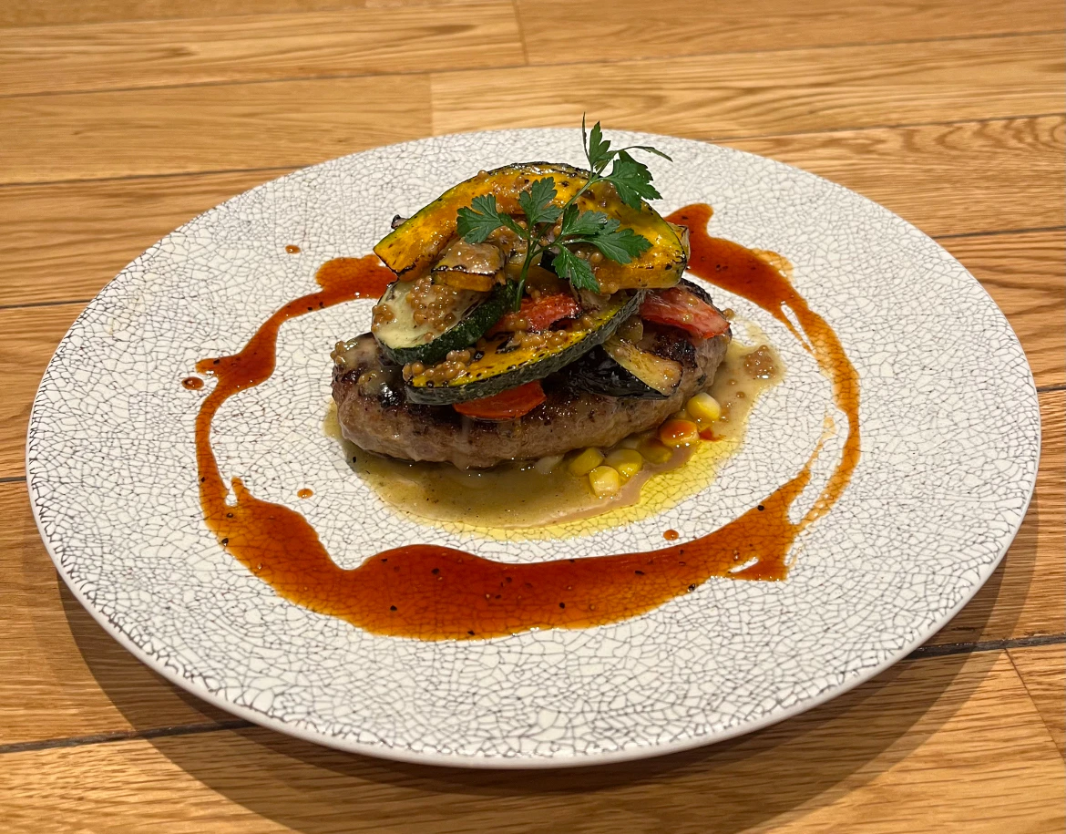 燻製の香りとニンニクが効いたBBQソースにハニーマスタードと和えた夏野菜で食べていただくハンバーグです。